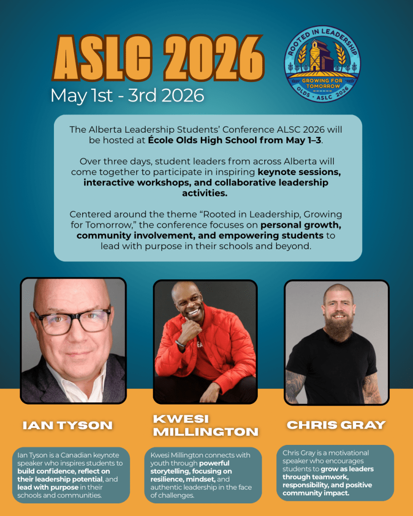 Ecole Olds High School is proud to host ASLC 2026! This year, students and advisors will hear inspirational keynote speakers, experience impactful connections with other students from across Alberta, learn new leadership skills, and believe that students are “rooted in leadership, growing for tomorrow.”